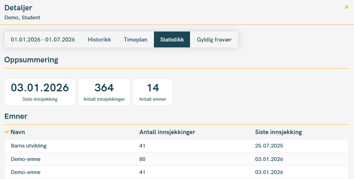 På Statistikk, gir NOA en oversikt over antall emner studenten har og har hatt, siste innsjekking per emne og generelt, antall innsjekkinger totalt og per emne.