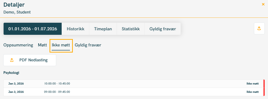 Gyldig eller godkjent fravær vil inkluderes i MØTT-statistikken, men har også egen separat liste for å se hvilke dager fraværet gjaldt.