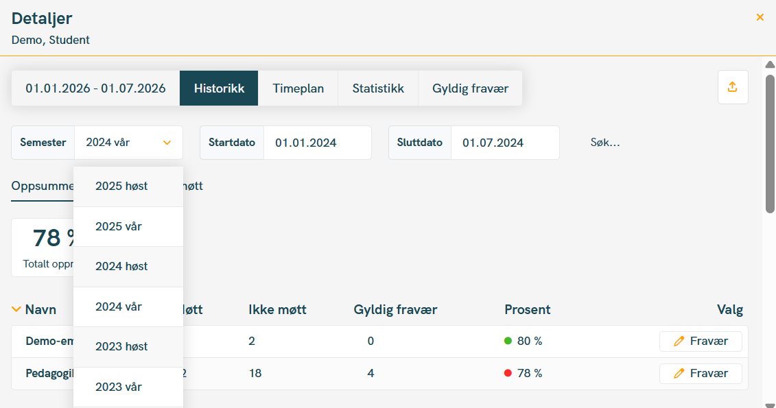 På inneværende semester får man en oppsummering med totalt oppmøte i %, eventuelt dager og timer fravær hvis studiestedet har den innstillingen, man får selvsagt oversikt over emnene studenten følger, hvor mange ganger de har møtt, ikke møtt, gyldig fravær og status på oppmøteprosent hittil i emnet. Bakerst er en knapp hvor man finner dagene og timene en student har fravær i emnet eller en gruppe, se under. Her kan ansatte eventuelt korrigere fravær og sjekke inn studenten bakover i tid. Studiestedet kan sette hvor mange dager bakover i tid en foreleser kan etterregistrere, så dersom du ikke får tilgang, hør med emneansvarlig eller en administrator.
