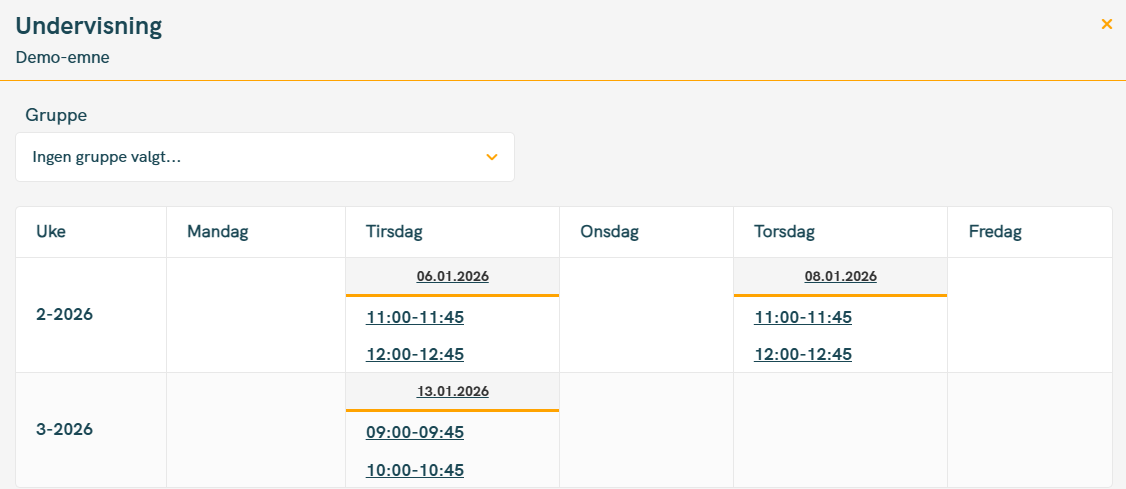 Timene de skal møte opp til, lages eller finnes under fanen Undervisning.