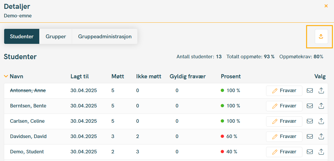 Når du går inn på Detaljer og står på fanen Studenter, finner du oversikt over antall studenter i emnet, oppmøteprosent hittil i emnet og oppmøtekravet dersom det er satt på emnet.