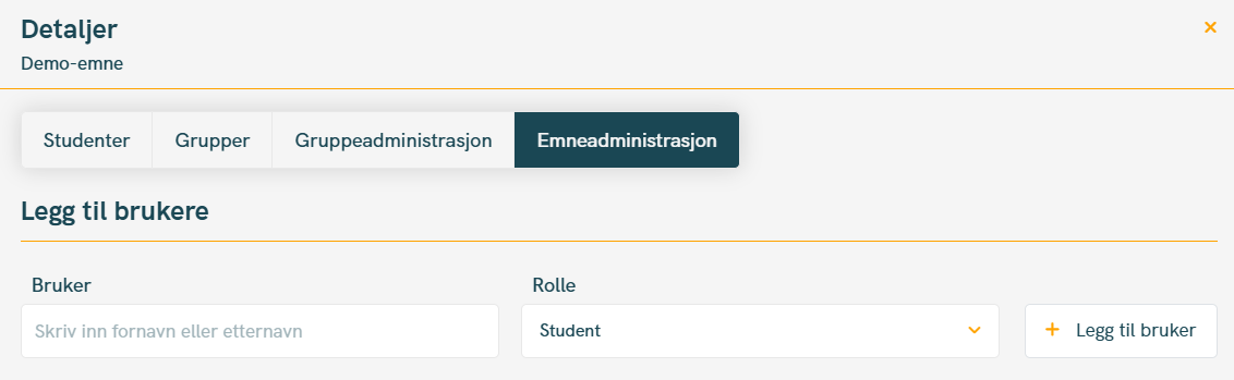Her kan man + legge til brukere og gi dem aktuell rolle; foreleser, emneansvarlig eller student og de havner da under kategori Ansatte eller Studenter.