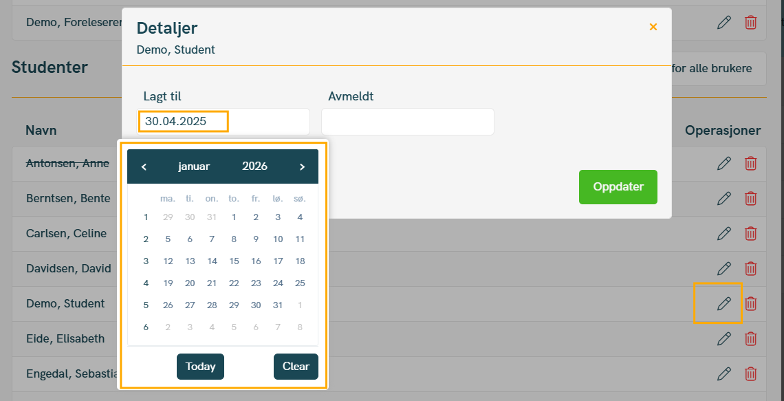 Av og til har studenter deltatt på undervisning men ikke kommet inn i systemene enda. Dersom de skal ha med oppmøte som har vært før denne dato, må man korrigere datoen for når studenten ble lagt til. Man kan sette en felles dato for alle studentene i emnet ved å velge “Endre for alle brukere”, eller på en enkelt student ved å gå inn på blyant-symbolet under Operasjoner.